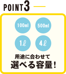 | 内容量 | 100ml(瓶タイプ)、500ml、1ℓ、4ℓ |