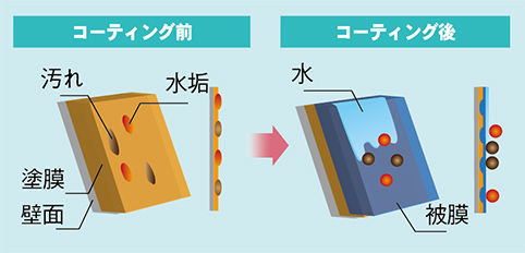 壁面基材(コンクリート、レンガ等)をコーティングすることで、水滴や汚れが表面を滑り、錆・汚れをよせつけず、お掃除が楽になります。